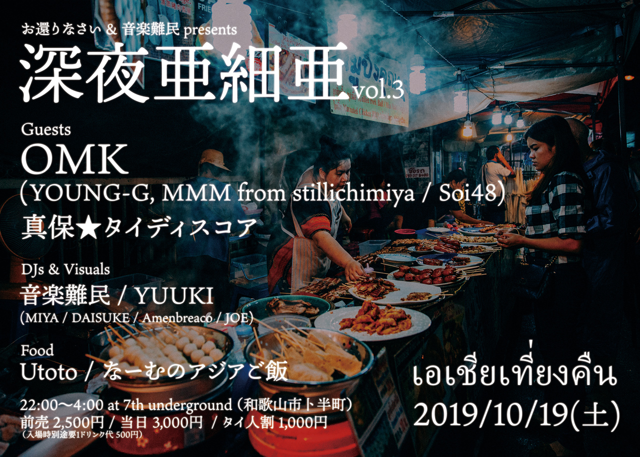 毎度大好評のアジアオールナイトイベント『深夜亜細亜』の第3弾! 今回のゲストは、stillichimiyaメンバーのYOUNG-G&MMMとSoi48によるタイ音楽プロジェクトチームOMK! タイ現地を知り尽くす彼らがタイのリアルミュージックをたっぷり紹介!!! さらに関西タイ音楽シーンになくてはならない存在、真保★タイディスコア も参戦! 迎える和歌山DJ陣は音楽難民クルー&YUUKI! Utoto&なーむのアジアご飯の絶品アジア飯も出店! 7th undergroundの階段を降りれば、そこは地下亜細亜! アジア音楽meets絶品アジア飯(+酒)の楽園(パラダイス)!! タイ国籍の方は特別割引あり!