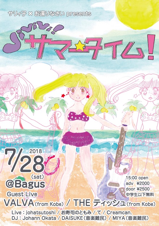 神戸より個性派サイケデリックポップバンドのVALVA、ユニークでポップな世界観を持つTHE ティッシュをゲストに迎え、海の家バグースにてお昼からのプチビーチフェスを開催!和歌山からも厳選したアーティスト達が参加します!